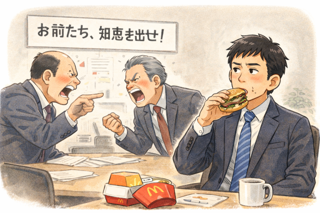 会議室に戻りやんややんや言い合う人たちを横目に、私は黙ってビッグマックをむしゃむしゃと食べ始めた。